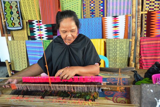 14:00 Uhr – Wir besuchen das traditionelle Dorf Sukarara im Süden auf dem Weg zum Hafen Lembar. Sukarara ist bekannt für seine komplexen und wunderschön gewebten Stoffe, die einen wesentlichen Teil der Identität Lomboks darstellen. Nur eine halbe Stunde Autofahrt von Mataram entfernt, liegt das Dorf im Herzen Lomboks. Es ist spezialisiert auf Songket, einen aufwendig gemusterten Stoff, der durch das Einweben von Gold- oder Silberfäden veredelt wird. Diese Fäden heben sich von den anderen Farben ab und erzeugen einen schimmernden Effekt. Die Motive des Songkets sind vielfältig; manche zeigen Blumen- oder Hühnermotive, jedes mit einer eigenen Bedeutung. Die gewebten Artikel bestehen aus Baumwollstoff, Silberfäden, Nylon und Seide. Die Farbstoffe stammen aus natürlichen Quellen wie Bleibetel, Rinde, Kurkuma oder Tamarinde. Das Weben erfolgt traditionell von Hand und viele Einheimische verbringen ihre Tage mit dieser Kunst. Es können verschiedene Produkte wie Kleidung, Tischdecken, Decken, Schals und Stoffe hergestellt werden. Besucher haben zudem die Möglichkeit, das Weben selbst zu erlernen und mehr über die Komplexität und die Prozesse zu erfahren. Die meisten gewebten Stoffe werden in Heimarbeit gefertigt und in vielen Souvenirläden zum Verkauf angeboten.